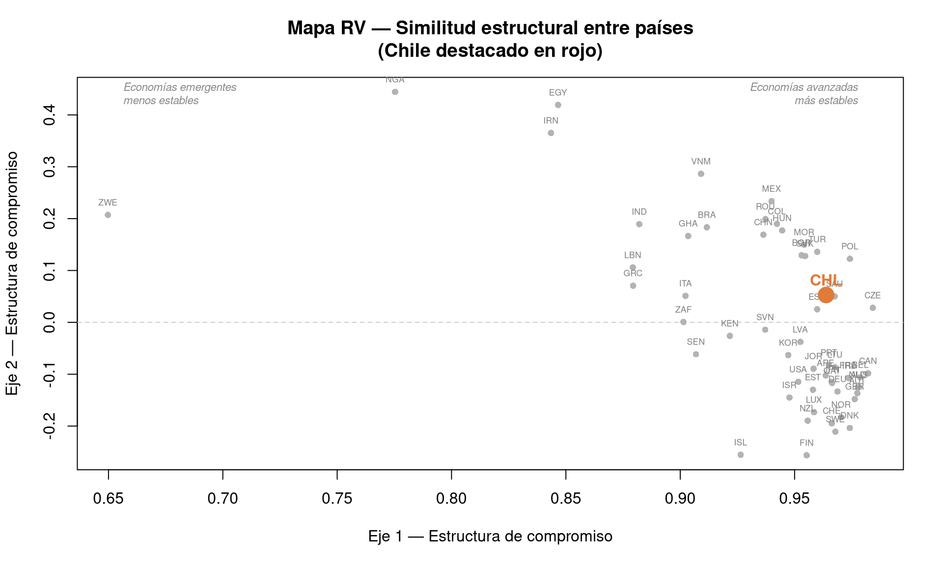 Chile en el mapa RV: Chile aparece en una zona intermedia, agrupado con países como España y Portugal — economías con mercados de tamaño mediano y un nivel de desarrollo institucional moderadamente alto. Su posición relativa confirma el puesto 33° en el GCI 2019.