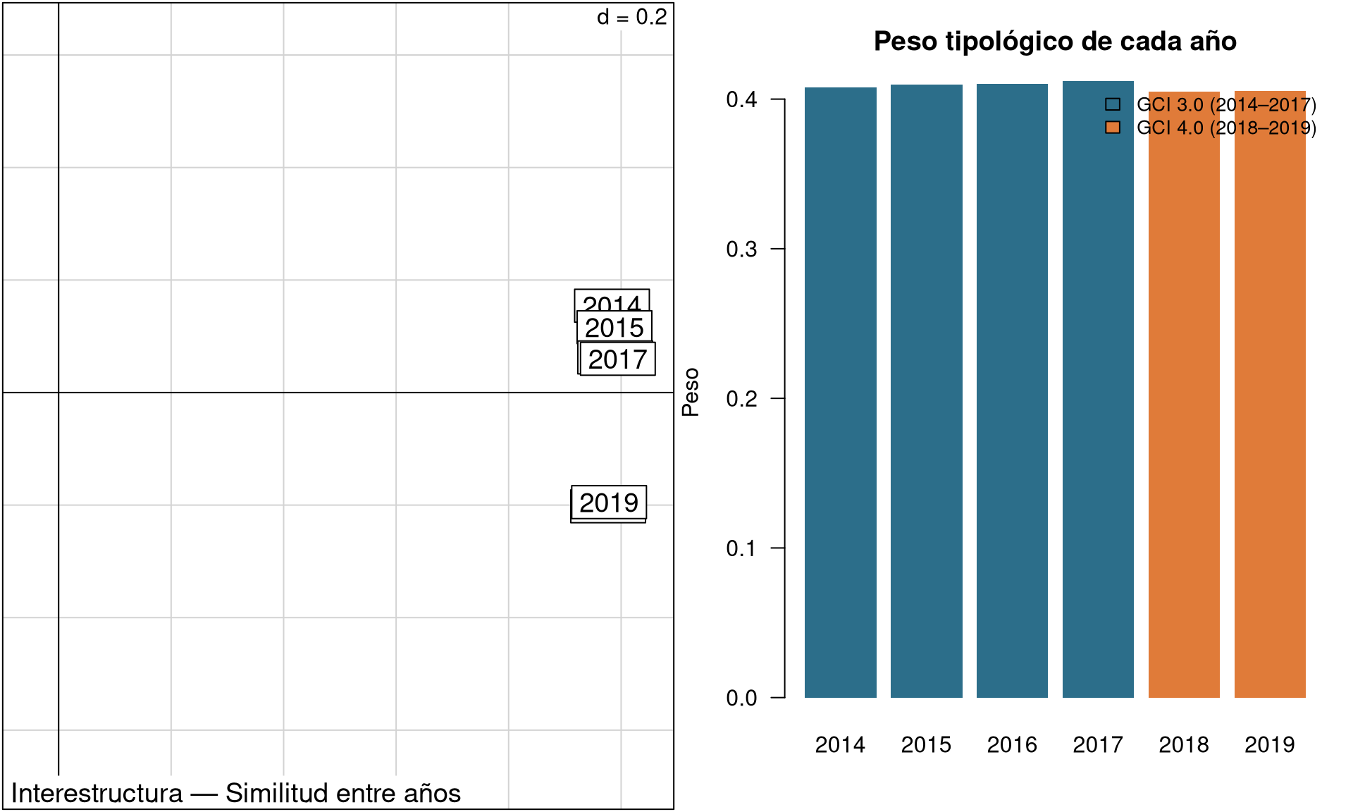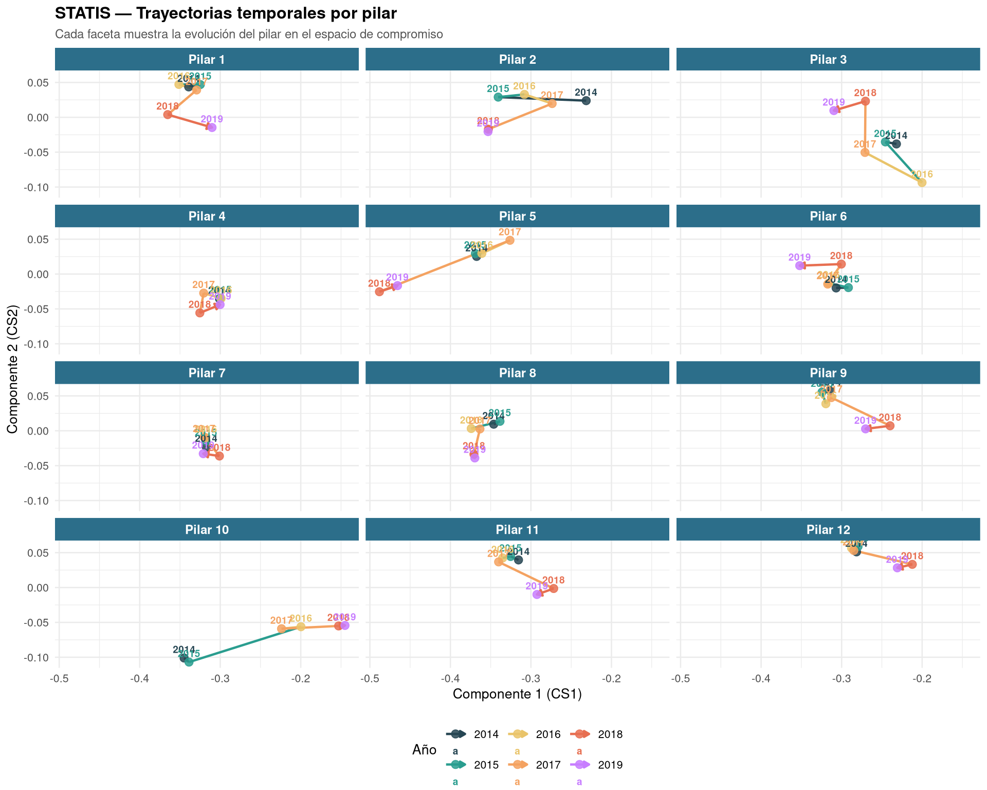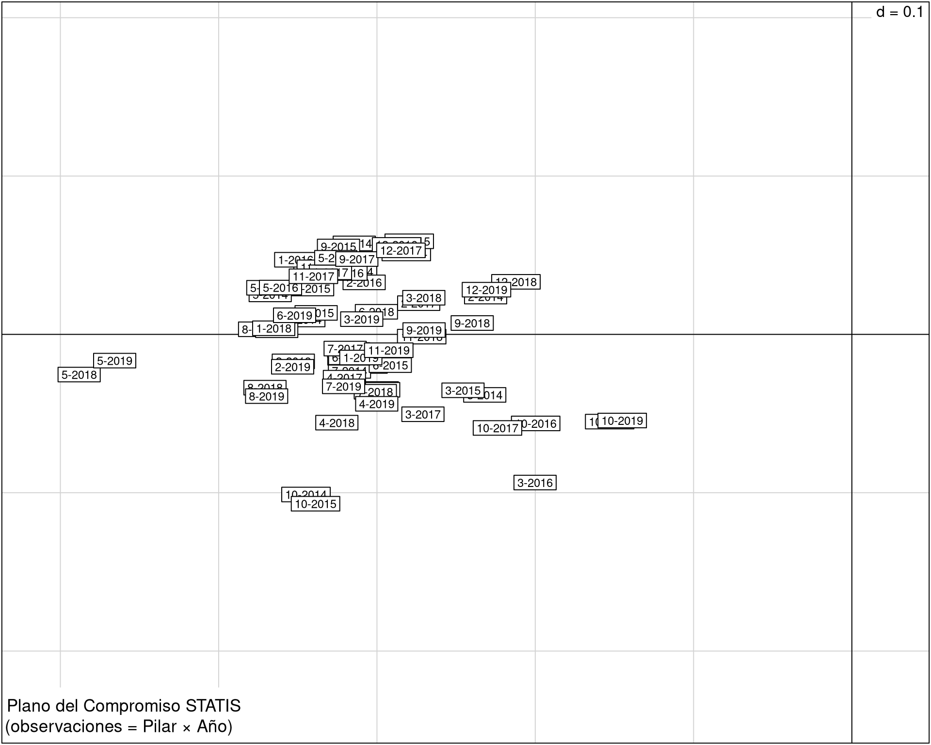 Habitualmente, se comparan pilares a lo largo de periodos, sin considerar los cambios metodológicos. A continuación STATIS permite cuantificar y visualizar si los cambios de los pilares a lo largo del periodo, corresponden a factores económicos, estructurales, o una mezcla de ambos. Para determinarlo se analizó los cambios a nivel estructural de los pilares año a año.